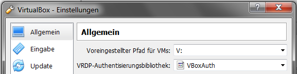 | D) Installations-Pfad für die virtuellen Maschinen anpassen da sonst die Dateien in den Ordner %USERPROFILE%/.VirtualBox angelegt werden. Ein nachträgliches Verschieben ist aber kein Problem (Menü - Datei > Einstellungen > Allgemein ->Voreingestellter Pfad für VM's:) z.B. Eine einge SSD für die Daten |