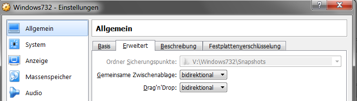 I) Drag and Drop von Dateien und Zwischenablage ermöglichen - Im VirtualBox Manager auf Ändern > Allgemein > Erweitert > Gemeinsame Zwischenablage & Drag'n'Drop auf bidirektional setzen. |