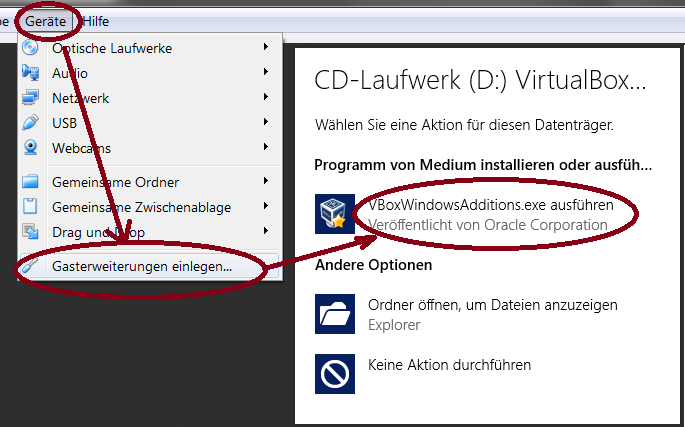 H) Windows in den VM installieren - Windows 7 DVD in den DVD-Schacht einlegen. - Im VM Manager den neuen Eintrag anklicken und starten - Windows Installation durchführen. - ggf. Windows-Updates und Programme installieren - Geräteerweiterungen installieren ! + In der virtuellen Windows-Sitzung Host-Tast+ Pos1 (rechte STRG + Pos1) > Geräte > Gasterweiterungen einlegen... aufrufen. Sollte dann das Dialog-Fenster nicht öffen kann die Erweiterung auch über den Dateimanager installiert werden (meist D: Virtualbox Guest Additions) Die Erweiterung starten, installieren und danach das virtuelle Windows neu starten.