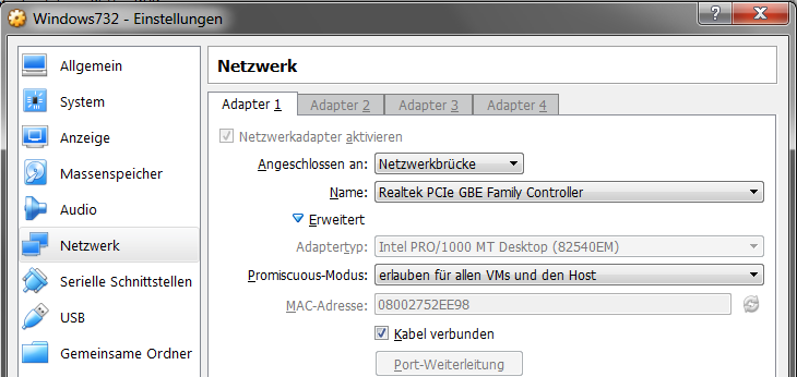 - Im VirtualBox Manager > Andern > Netzwerk > Adapter 1: + Netzwerkadapter aktivieren + Angeschlossen an: Netzwerkbrücke auswählen (dadurch ist die VM im eingenen Netzwerk erreichbar und die VirtualBox erzeugt kein eingenes Subnetz.) + Bei Erweitert den Promiscuois-Modus: erlauben für alle VMs und den Host |