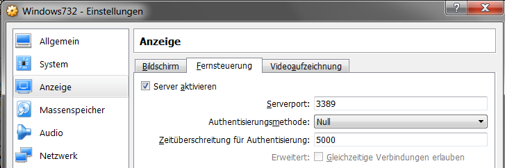- Im VirtualBox Manager > Ändern > Anzeige > Fernsteuerung + Server aktivieren anklicken. |