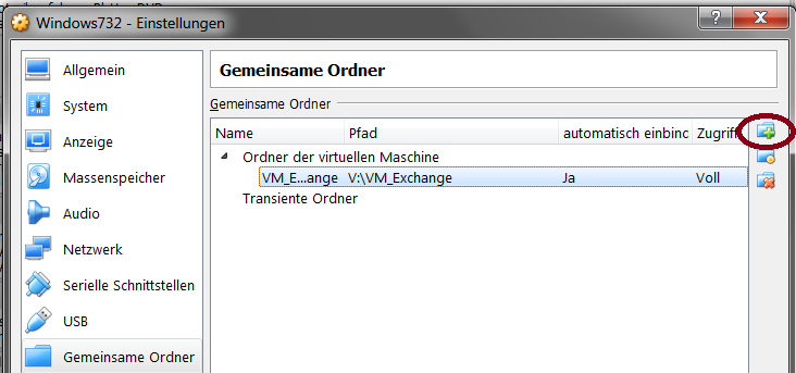 G) Gemeinsame Ordner festlegen für Datenaustausch (ohne Windowsfreigabe) - Ändern anklicken > Gemeinsame Ordner > Gemeinsamen Ordner hinzufügen und danach den Ordner auswählen. Dieser Ordner ist dann nach der Installation im virtuellen Windows vorhanden (wenn innerhalb des virtuellen Windows die Virtualbox Guest Additions nachinstalliert wurde s.U.) |