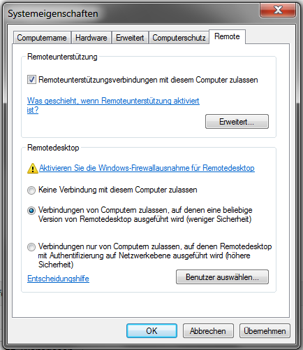 J) Remote Desktop (RDP) Zugriff auf die Virtuelle Maschine - Im virtuellen Windows die RDP Freigabe aktivieren. In der CMD-Shell oder Ausführen (Windows-R Taste) sysdm.cpl starten auf das Register Remote wechseln, dort Remoteunterstützungsverbindung mit diesem Computer zulassen anklicken und Verbindungen von Computern zulassen, ... auswählen. |