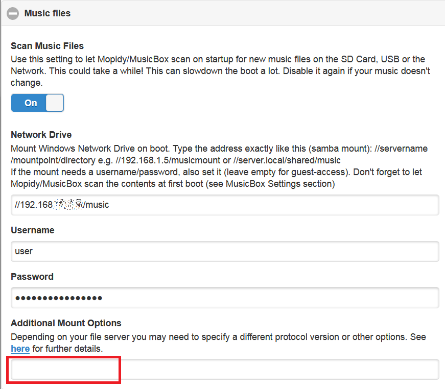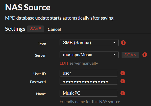 In der 'Pi Musicbox' gibt es nur einen Eintrag für einen Netzwerkzugriff auf ein NAS bzw.SAMBA-Zugriff (SMB, CIFS).