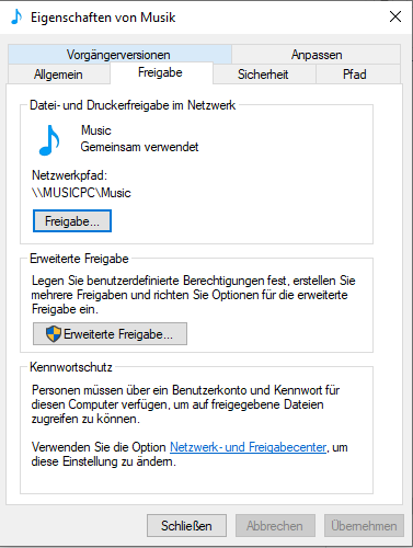 Rechte Maustaste auf Musik > Eigenschaften => Register Freigabe > Freigabe... Button anklicken > Personen für die Freigabe auswählen z.B. User und Freigabe anklicken.