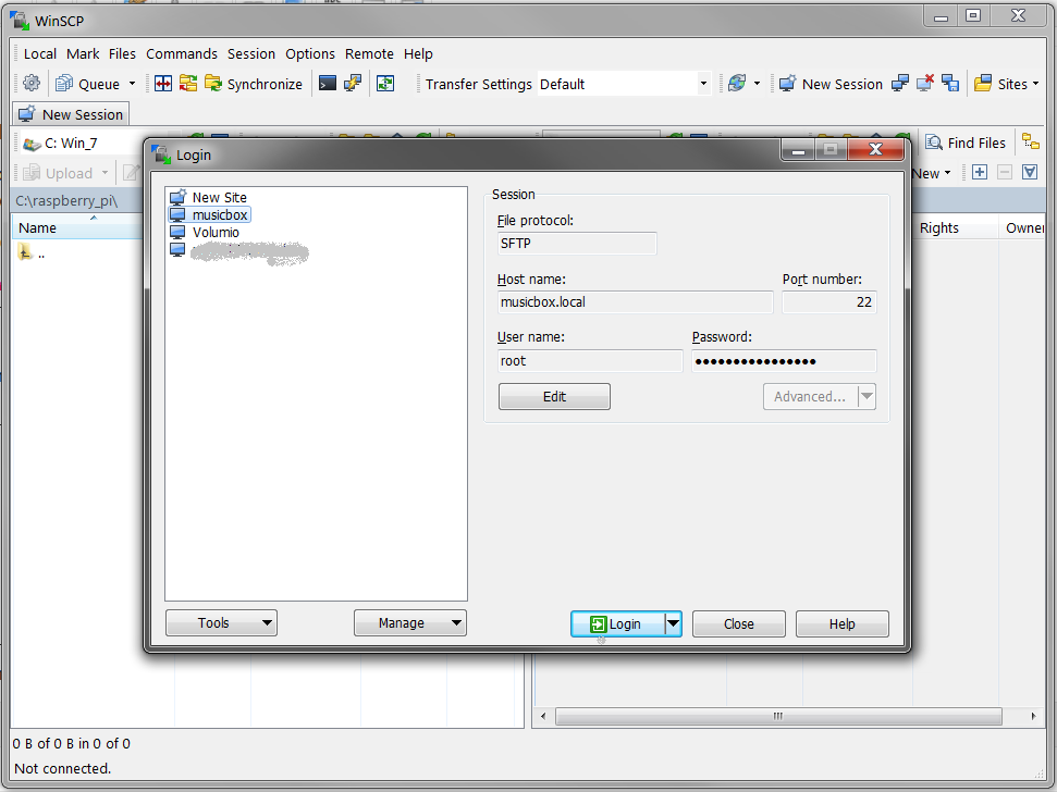 | Geht leider nicht über das Web-Frontend sondern muss via SSH in enem Datei-Editor angepasst werden. 1) z.B. WinSCP (portable) verwenden. Dieser hat schon einen integrieren Editor und Linux-Befehle werden hierfür nicht benötigt. 2.) WinSCP.exe starten. Mit den bekannten Zugangsdaten für die 'Pi Musicbox' sich damit verbinden. 3.) in den Ordner /music/playlists wechseln. Hier werden alle Playlisten aufgelistet. Die Playlist '[Radio Streams].m3u' enthält alle gespeicherten Streams. |