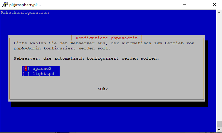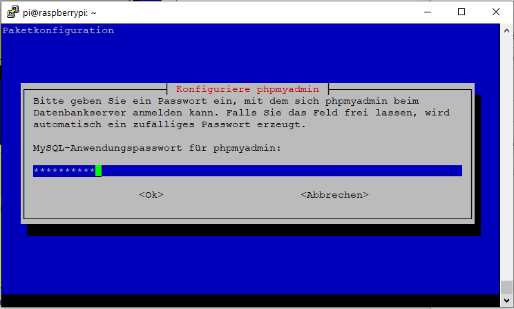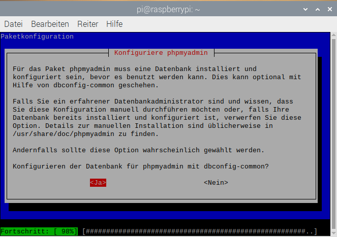 Wichtig ist dass noch kein Passwort für root vergeben wurde sonst kann phpmyadmin nicht den user phpmyadmin anlegen. (Kann aber ggf. nachträgich gemacht werden)