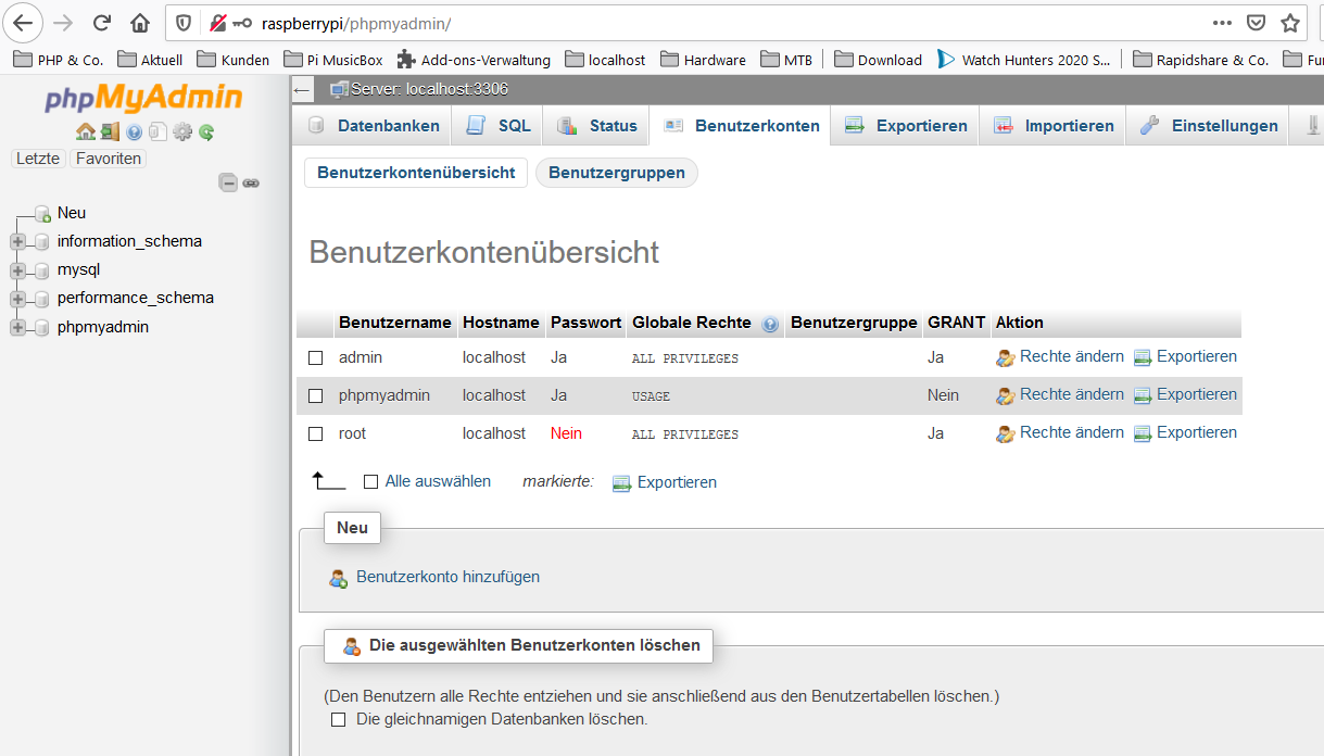 Nach erfolgreicher installation ist phpMyAdmin über die Web-Oberfläche erreichbar. http://raspberrypi/phpmyadmin/ Ein login ist möglich, mit beschränkten Rechten. User: phpmyadmin PW: 'Passwort' |