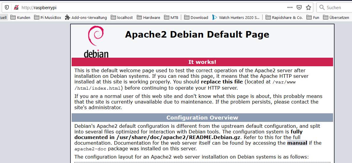 Im eigenen Netzwerk: http://raspberrypi/ bzw. unter der IP-Adresse des Raspberry Pi's. Kann mittels ifconfig (Linux) oder ping -4 raspberrypi (Windows PC) ausgelesen werden. Auf dem Raspberry Pi selbst auch unter http://localhost/ oder http://127.0.0.1/ |