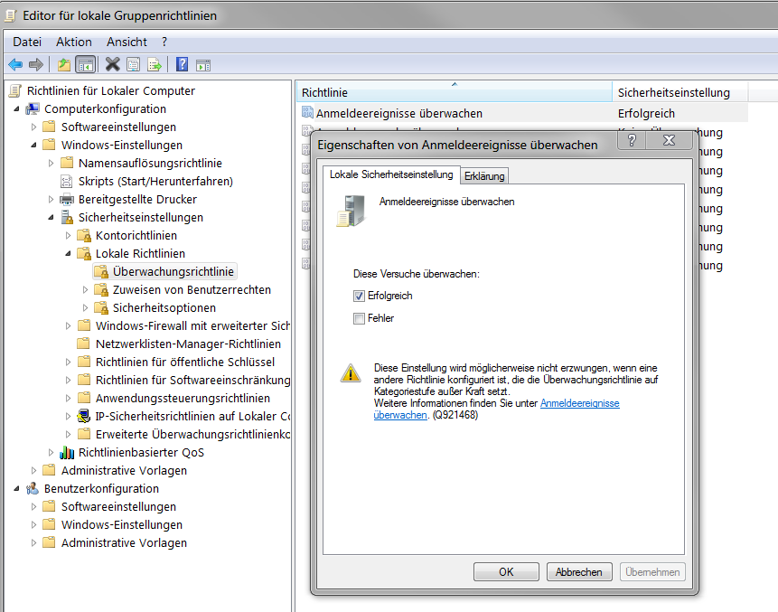 Des weiteren muss in den Überwachungs-Richtlinien das Anmelden eingeschaltet werden. Das geht über die lokalen Gruppenrichtlinien (gpedit.msc).