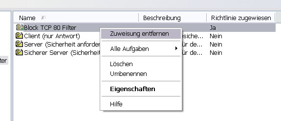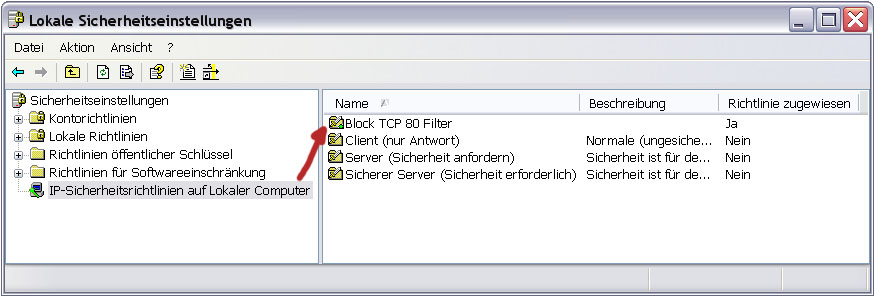 Um die "Lokale Sicherheitsrichtlinien" zu starten einfach secpol.msc in der CMS-Shell starten oder über Systemsteuerung -> Verwaltung -> "Lokale Sicherheitsrichtlinien" aufrufen. Unter IP-Sicherheitsrichtlinien auf Lokaler Computer steht dann ein neuer Eintrag "Block TCP 80 Filter".